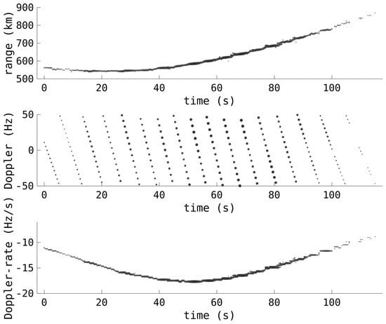 Example range, Doppler, and Doppler-rate detections from a typical satellite pass detected by the HFLOS radar. The Doppler measurements are ambiguous and the range–Doppler coupling bias has not yet been removed.