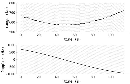 Figure 8 contains the same detections as Figure 7. However, now the Doppler has been correctly unwrapped and the range–Doppler coupling bias has been removed. The range–Doppler coupling correction has altered the ranges by almost 100 km at the beginning and end of the pass, correcting the previously lopsided range profile. Also shown in the figure is the large number of ambiguities, being only 100 Hz apart, highlighting the very narrow ambiguous window where these detections are formed.