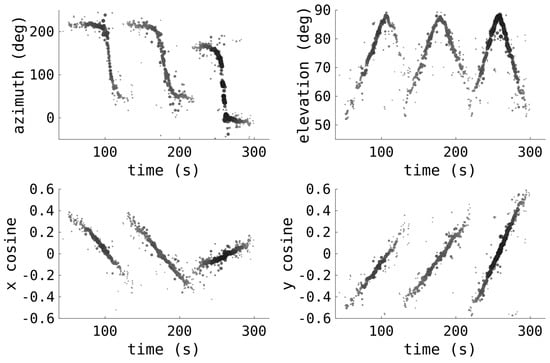 An example illustrating the benefit of these parameters is given in Figure 9, showing the pass of three RSOs near the zenith, with both azimuth and elevation as well as the direction cosines. As the RSOs approach the azimuth discontinuity at the zenith, there is a sharp jump in both azimuth and elevation. In comparison, the cosines are relatively simple trajectories. This greatly assists in tracking, allowing simpler spatial motion models and reduced process noise.