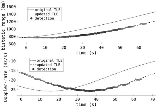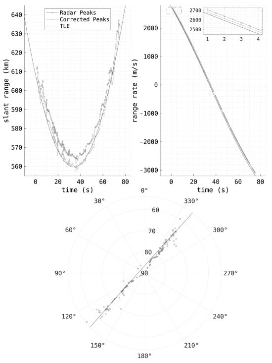 Figure 11 shows the detections of the HFLOS observation of a Starlink satellite, before and after ionospheric correction. The range error has been significantly reduced, with the detections now better matching the two-line element (TLE). There are also slight corrections to the Doppler and spatial parameters to improve the measurements. As the data were collected near solar minimum, the impact of the ionosphere on the radar measurements is considerably less than during solar maximum [18]. These methods are able to significantly improve the range measurements, with the mean range measurement error being reduced from 5 km to 1 km [46], albeit with a large standard deviation due to the coarse range resolution. The other measurement parameters are not significantly improved; however, even slight improvements to the measurement accuracy may greatly improve the resulting orbital accuracy.
