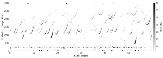 Range vs time profile of one hour of detections observed by the HFLOS radar. Only detections associated with Doppler-rate processing are shown. Many satellites are visible as well as a meteor band between 100 and 250 km. These observations occurred in 2018 and predate much of the recent rise in the number of RSOs in LEO.