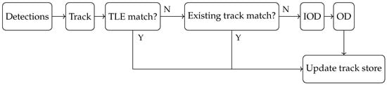 Figure 14 outlines the broad track management approach and indicates when the IOD and OD steps are required. A given track’s associated detections are used to determine if the detections are from a known object in the space catalogue; if not, they are used to determine if they match an object detected previously, and failing that, the detections are used to form an orbital estimate that can then be used to compare against subsequent passes.
