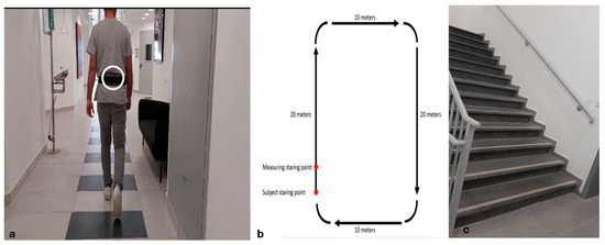 The smartphone location and the measurement environments. (a) Participant walking with a smartphone attached to the lower back via an elastic belt for motion data collection. (b) Schematic of the circular corridor used for gait assessment under single and dual-task conditions. (c) Staircase (13 steps; 16 cm height, 30 cm depth, 155 cm width) used for ascent and descent evaluation at a self-selected pace.