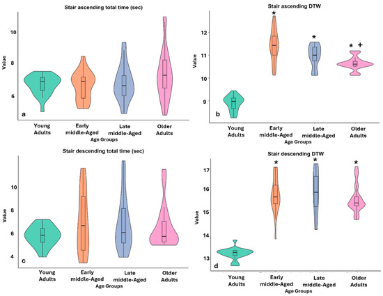 Age-related effects on stair ascent and descent: distributions of duration and movement similarity. Notes: DTW = Dynamic time warping. (a) Stair ascending total time (s); (b) DTW during stair ascent; (c) stair descending total time (in seconds); (d) DTW values during stair descent. The violin diagram shows the distribution of the groups: green for young adults, orange for early middle-aged, blue for late middle-aged, and purple for older adults. The box within the violin represents the interquartile range (IQR), with the center line indicating the median. Asterisks (*) indicate p < 0.001 compared to the young adult group, and plus signs (+) indicate p < 0.001 compared to the middle-aged group.