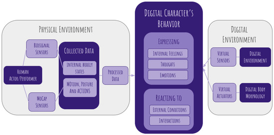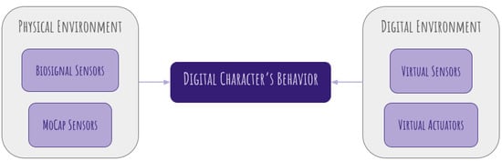 Simplified model of how physical and digital environments interact to shape the behavior of a digital character.