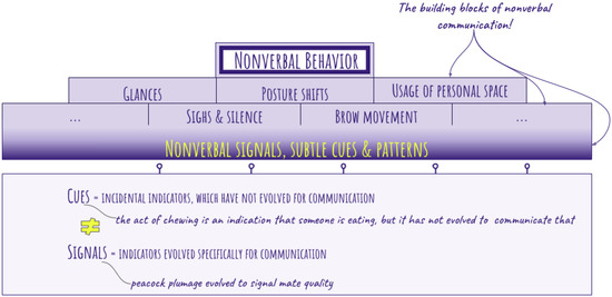 Before diving into the different types of nonverbal communication and its channels, it would be useful to define the difference between cues and signals. According to evolutionary biologists, cues essentially refer to incidental indicators, which have not, however, evolved for communication. On the other hand, signals have evolved specifically for communication (Figure 2). For instance, the act of chewing is an indication that someone is eating, but it has not evolved to communicate that specifically, while peacock plumage evolved to signal mate quality [24].