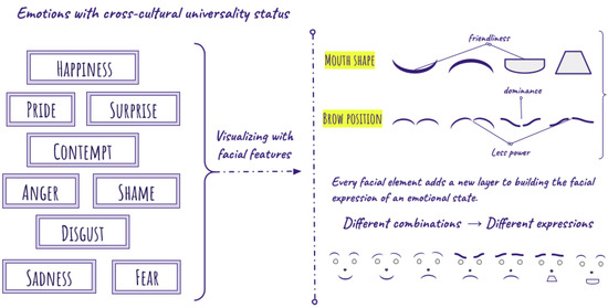 Facial expressions are a primary form of nonverbal communication, evolving from survival mechanisms to tools for social interaction. Darwin [46] proposed that expressions serve two functions: preparing organisms for environmental changes and conveying social information. This idea, later expanded into the Two-Stage Model, suggests that facial movements evolved from survival tasks, like rejecting harmful food, to signaling internal states and predicting others’ actions [46,47,48,49]. Ekman [34] identified nine universal emotions, including anger, fear, and happiness, which influence interpersonal trait perception [47]. For example, smiles signal friendliness, while frowns or furrowed brows convey dominance or distress. These facial expressions shape how we communicate emotions and interpret others’ intentions [50,51,52,53]. Consequently, different combinations of expressions of facial features can produce visualizations of different emotional states (Figure 3).