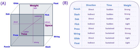 Blom et al. [71] define movement qualities as “distinctly observable attributes or characteristics produced by dynamics and made manifest in movement”, describing how bodies move in terms of energy, space, and time. These qualities combine to create unique movement dynamics involving specific values for space, time, forms, or shapes [71,72]. LMA focuses on these qualities within its effort category, analysing motion factors like weight, space/direction, time, and flow—each with polar opposites—resulting in Laban’s eight Basic Effort Actions (Figure 4), linked to both environment and personality traits [62,73]. These efforts have been widely applied in dance [69,74], character design and animation [70], as well as AI and robotics [68,75]. Recent research efforts have proved the effectiveness of the LMA framework to identify the expressed and/or perceived emotion in humans through computer vision [76,77] and AI-driven movement classification [78].