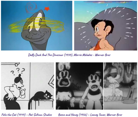 In traditional animations, we have many examples through applying some of the 12 principles of animation [102], e.g., exaggeration, an internal function or feeling of the character is visualised or sonified to convey the feeling. Think of the heart popping out of the body while beating in classic Tom and Jerry [103] to convey the feeling of fear, love, or shock of the character, or exaggerated sweating to show exhaustion, stress, or anxiety. Figure 6 includes some examples of shock, anxiety, confusion, fear, and surprise visualised in animated clips that are currently part of the public domain.