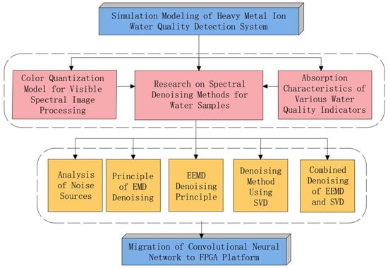 The technical roadmap for the simulation modeling of the water quality detection system is shown in Figure 1. This method is based on the color quantization model of visible spectral image processing and the absorption characteristics of various water quality indicators, and it focuses on research on spectral denoising methods for water samples. Based on the analysis of noise sources, the principles of denoising using Empirical Mode Decomposition (EMD), Ensemble Empirical Mode Decomposition (EEMD), and Singular Value Decomposition (SVD), a combined denoising method integrating EEMD and SVD was developed. This method was applied for the first time in spectral water quality detection. Finally, a Convolutional Neural Network (CNN) model was constructed and deployed on an FPGA platform to form a water spectral analysis system. The FPGA used was the Xilinx Zynq UltraScale+ MPSoC XCZU19EG, a powerful development board that integrates ARM Cortex-A53 and Cortex-R5 processing cores with programmable logic (FPGA) resources, suitable for complex system design and development. This approach successfully enabled the rapid and accurate detection of five heavy metal ions (arsenic (As), copper (Cu), hexavalent chromium (Cr), lead (Pb), and mercury (Hg)) in water pollution.