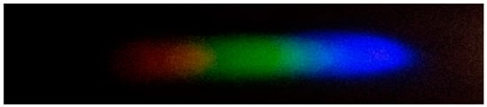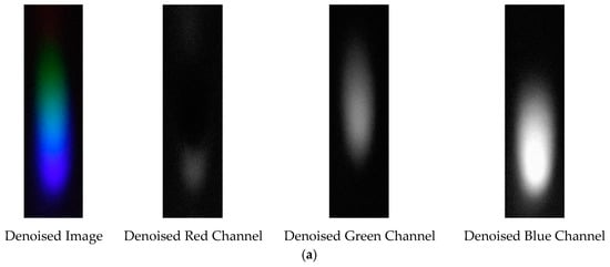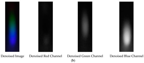 After the preparation of the standard solutions, the corresponding color-developing agents are added to each solution in sequence to enable the formation of complexes with hexavalent chromium ions, mercury ions, lead ions, arsenic ions, and copper ions, thereby causing coloration. Through image processing and spectral analysis, the absorption spectra of each ion are obtained to facilitate subsequent analysis and detection []. Considering that external lighting may interfere with the experimental results, a dark box is used for the optical path during imaging, with only an LED serving as the light source. It should be noted that there is a certain amount of noise in the image (as shown in Figure 2). To achieve denoising, the EEMD-SVD algorithm is applied to the image to remove noise and generate a new image (as shown in Figure 3). Subsequently, the processed image is cropped to form a 2500 × 700 window. After extracting the meaningful part, the RGB channels are processed. In this operation, quantization is performed using either the HSV model or the grayscale model, ultimately presenting the relationship between pixel intensity and signal intensity in the form of curves. All steps and operations related to image processing and curve drawing are completed on the MATLAB 2017a platform.