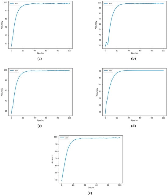 Accuracy of five heavy metal solution samples after 100 epochs of neural network training. (a) Cr; (b) Hg; (c) Pb; (d) As; and (e) Cu.