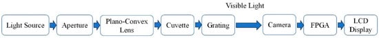 The water quality detection system established in this study integrates multiple aspects, including optical path structure, hardware, and software systems. The optical path design draws on the principles of visible spectrophotometry, and the specific design details can be seen in Figure 5. Based on the Beer–Lambert Law, the system includes a light source, a plano-convex lens, an aperture, a grating, and a cuvette, utilizing a visible light source to take advantage of the absorption characteristics of lead, copper, mercury, arsenic, and hexavalent chromium ions in visible light. The visible light source for the continuous spectrum in this detection system ranges from 390 nm to 780 nm. A white-light LED powered by three AA batteries (DC 3–5 V) is used. The monochromator disperses composite light into single-wavelength light. Though 100% monochromatic light is not achievable, bandwidth is crucial. Narrower bandwidth enhances analytical sensitivity and ensures a linear relationship between substance concentration and optical response. There are two main types of monochromators. Prism systems, simple in structure but with limited resolution, are unsuitable for miniaturized devices. Grating systems, offering a wide wavelength range, uniform dispersion, and high resolution, are ideal for portable instruments. In this study, the monochromator, combining a diaphragm, plano-convex lens, and holographic diffraction grating, boosts spectral analysis performance.