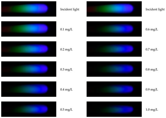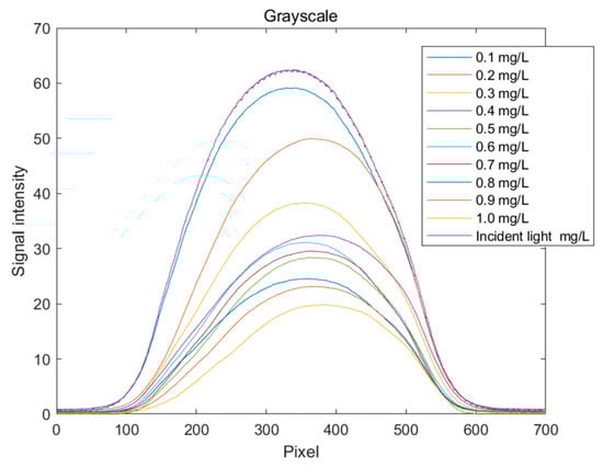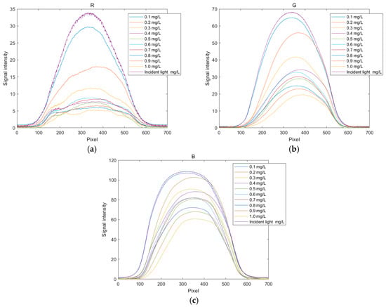 After processing with MATLAB, the relationship curves between pixel values and signal intensity can be drawn for images of copper solutions at various concentrations. The spectral diagrams of copper solutions at different concentrations are shown in Figure 6, and the related R, G, and B spectral curves are shown in Figure 7. The copper solution shows a cyan–blue color after coloring, which absorbs orange light according to the complementary color theory. It can be clearly seen from Figure 6 that the R channel value curve undergoes significant changes, indicating that the copper solution has a stronger absorption capacity for red light, resulting in a lower energy peak in the red value distribution curve. As the concentration of the copper solution increases, the red value distribution curve will further decrease. From Figure 7, it can also be seen that the G channel changes significantly, with higher absorption of green light by the copper solution. Compared to other channels, the B channel value curve changes less. Therefore, in the R, G, and B channels, the positions with significant changes in pixel values were selected as 350, 350, and 300, respectively, to establish the corresponding standard curves based on these quantization values.