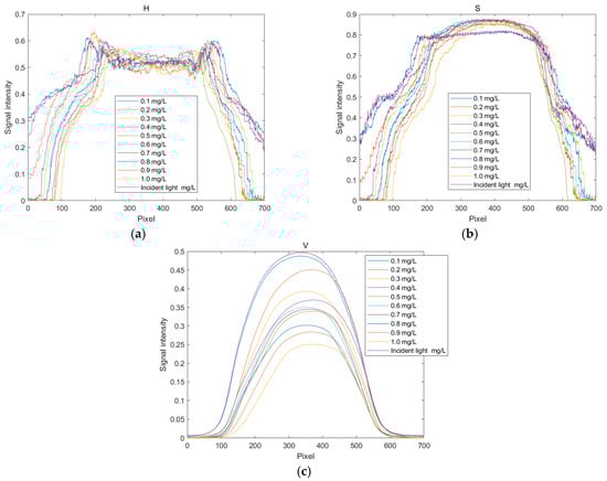 The distribution curves of the H, S, and V values for copper solutions at different concentrations are shown in Figure 8. Since these solutions appear cyan–blue, their hue (H) value hardly changes significantly with an increasing concentration, as seen in Figure 8a. Figure 8b,c illustrate the changes in saturation (S) values with the concentration of the standard solution. The observations indicate that the changes in saturation are more pronounced in the red region, while they are less noticeable in other color regions. Within the range from yellow–green to red, the brightness decreases gradually with an increasing concentration, indicating enhanced light absorption in this region. Therefore, when establishing the standard curves for the H, S, and V indicator values, the quantization values at pixel positions 200, 350, and 350 are selected in sequence.