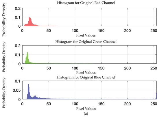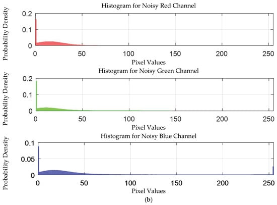 The probability density distribution of the RGB values of the 0.03 g/mL lead ion solution without and with added Gaussian noise is shown in Figure 20.