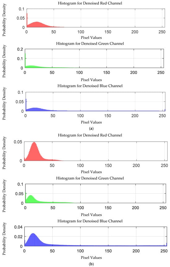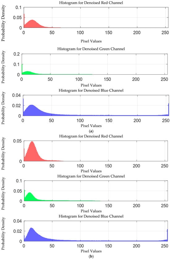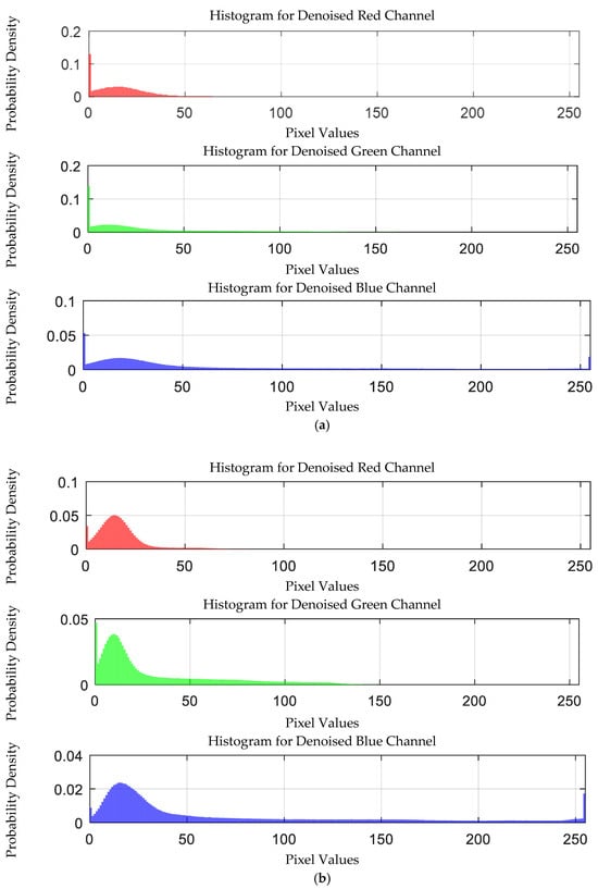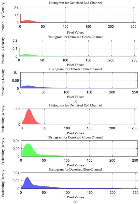 Probability density distribution of RGB values of 0.0003 g/mL mercury ion solution after denoising. (a) EEMD denoising; (b) EEMD-SVD denoising.