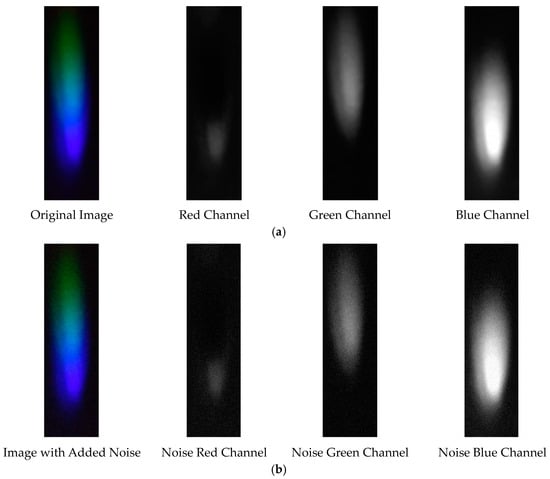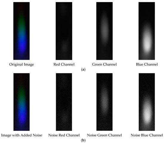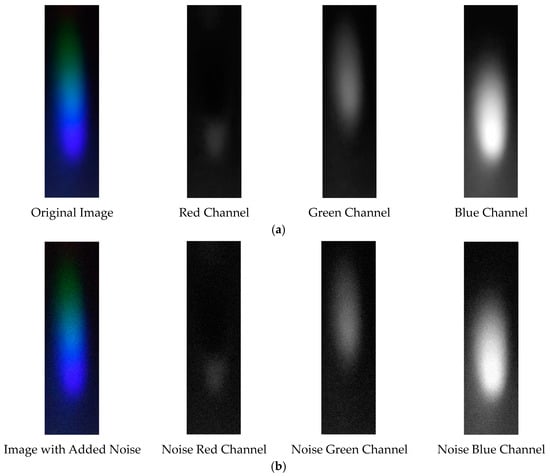 Visible light of 0.0003 g/mL mercury ion solution. (a) Without added Gaussian noise; (b) with added Gaussian noise.