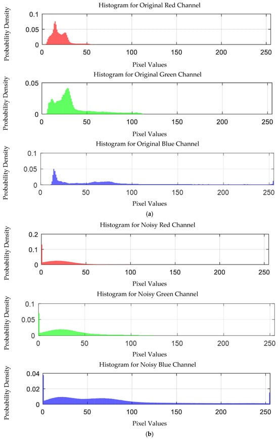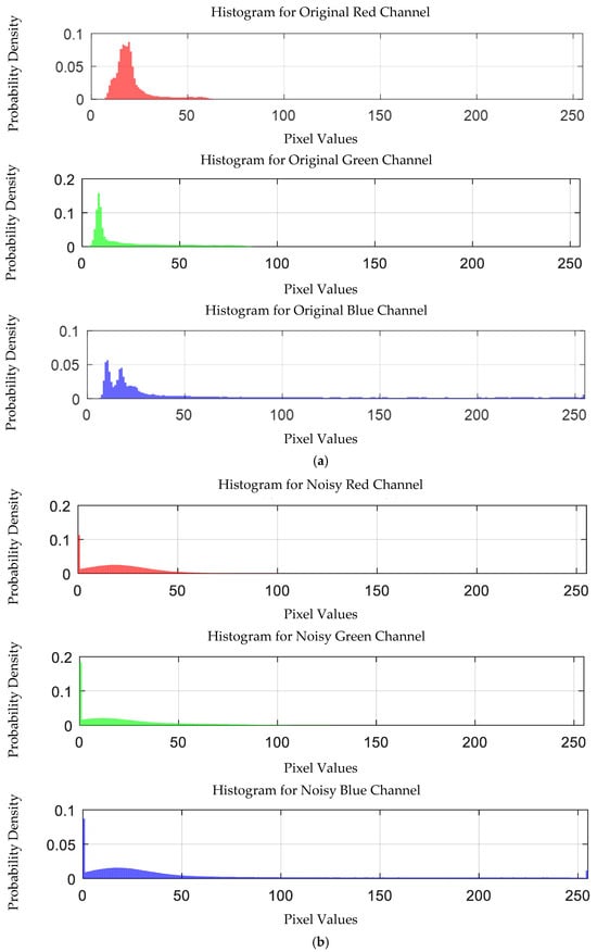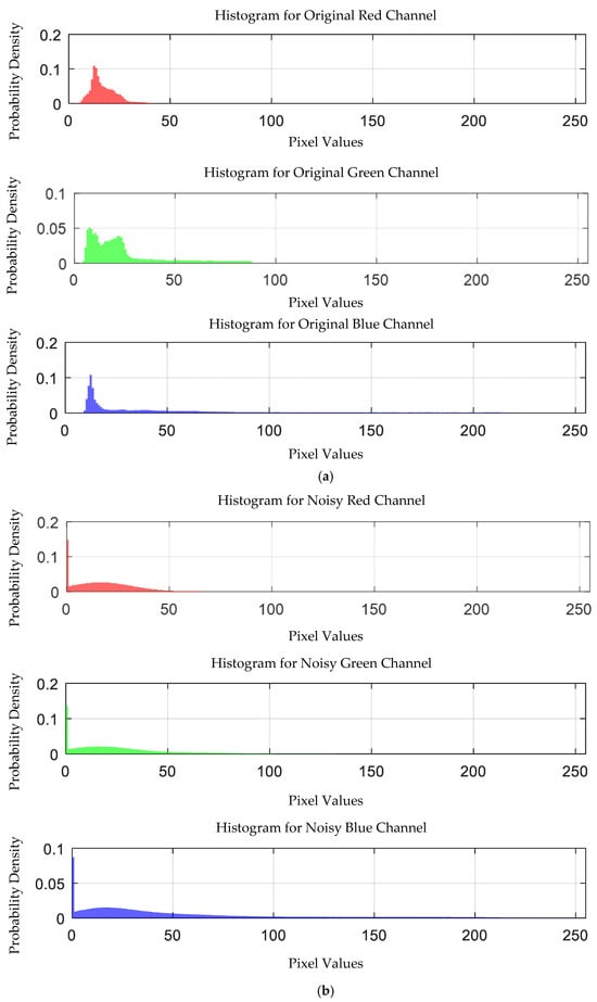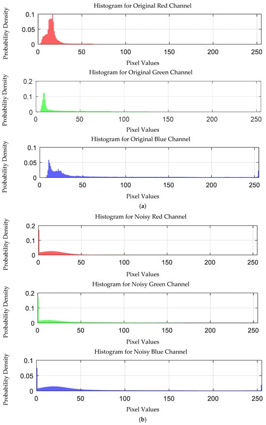 Probability density distribution of RGB values of 0.05 g/mL chromium ion solution without and with added Gaussian noise. (a) Without added Gaussian noise; (b) with added Gaussian noise.