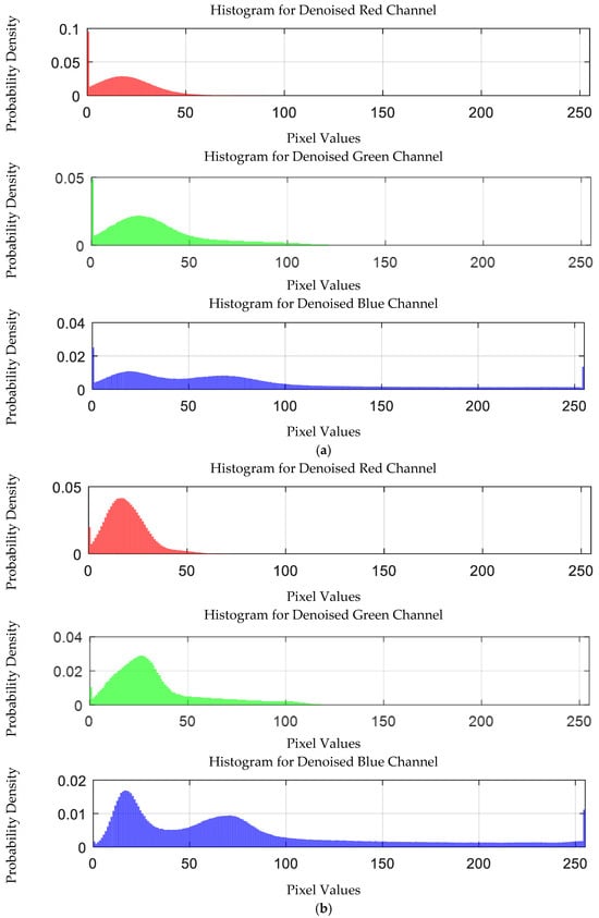 Probability density distribution of RGB values of 0.03 g/mL lead ion solution after denoising. (a) EEMD denoising; (b) EEMD-SVD denoising.