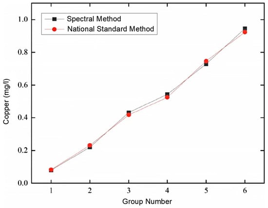 As shown in Figure 31, there is good consistency between the national standard detection method and the ZYNQ-based spectral water quality analysis detection system in the determination of the copper (Cu) concentration. From Table 5, it can be seen that the relative error range of the detected copper (Cu) values is between −8.7% and 7.32%, all less than 10%, and the repeatability is less than 4.06%, below the standard requirement of 10%. These results indicate that the detection system meets the technical indicators of the Chinese national environmental protection standard “HJ/T 354-2007 Technical Specification for Acceptance of Water Pollution Source Online Monitoring System”. Moreover, the system has the advantage of rapid detection, fully meeting the needs of water quality detection. It should be noted that the repeatability in Table 5 refers to the degree of consistency between the independent test results obtained via the system when measuring the same water quality parameter in a sample multiple times under the same precision conditions. Repeatability is described using the relative standard deviation (RSD), as shown in Equation (14):