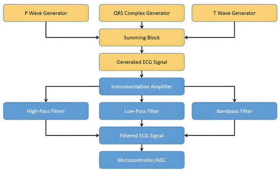 The electrodes are connected to the instrumentation amplifier, followed by the high-pass, low-pass, and band-pass filters. The circuit conditions the ECG signal before feeding it into a microcontroller or ADC. To evaluate the performance of sensors in ECG signal processing, the generation of various ECG signals is essential. This can help test how well the sensors and signal conditioning circuit handle different types of ECG data.