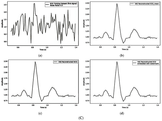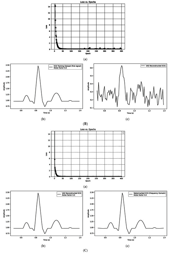 (A) Embedding a watermark into the mean () of the VAE model: (a) the loss vs. epochs; (b) ECG training data; and (c) VAE model-generated ECG embedded with a watermark. (B) Embedding a watermark into the latent variable (z) of the VAE model: (a) the loss vs. epochs; (b) ECG training data; and (c) VAE model-generated ECG embedded with a watermark in the latent variable (z). (C) Embedding a watermark through the frequency domain: (a) the loss vs. epochs; (b) the reconstructed ECG with the VAE model; and (c) ECG embedded with a watermark.