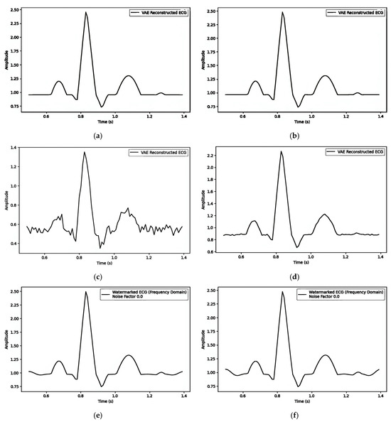 The simulated ECG at (a) alpha 0.5 and (b) alpha 0.9 embedding the watermark in the mean (); (c) alpha 0.5 and (d) embedding watermarks through the latent variable (); (e) alpha 0.5 and (f) alpha 0.9 embedding watermarks through the frequency domain.