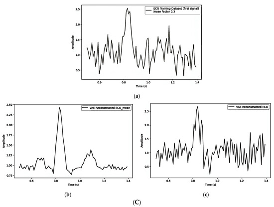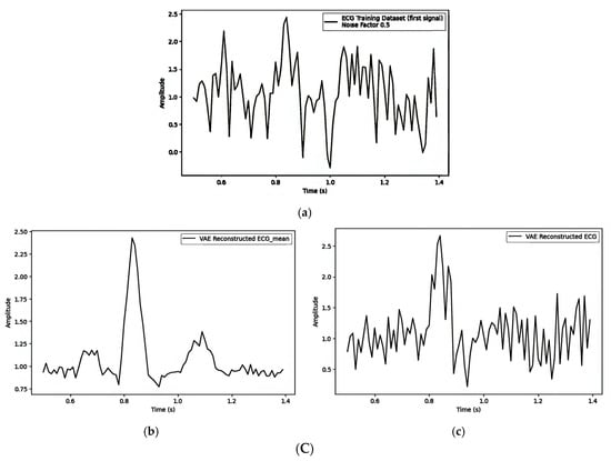 (A) Embedding the watermark in the mean () with noise_factor = 0.1: (a) first original training signal; (b) mean of all training signals; and (c) VAE-reconstructed signal with watermarking. (B). Embedding the watermark in the mean () with noise_factor = 0.3: (a) first original training signal; (b) mean of all training signals; and (c) VAE reconstructed signal with watermarking. (C) Embedding the watermark in the mean () with noise_factor = 0.5: (a) first original training signal; (b) mean of all training signals; and (c) VAE-reconstructed signal with watermarking.