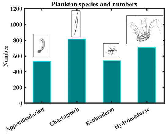 In order to generate datasets that can be used for target segmentation and detection tasks, the transmission function o (xo,yo) of several targets in the plane zo needs to be established. A composition of shadow images is collected by the In Situ Fish-Plankton Imaging System (ISIIS), the subject of a competition on Kaggle (a big data competition platform) [19]. This open-source dataset consists of 121 species of marine plankton, of which 4 species with a number of images greater than 500 were selected for our simulations, as shown in Figure 2.