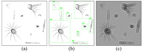 Plankton images and hologram: (a) original image; (b) YOLO labeled images; (c) hologram.