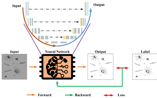 In nature, the deep learning method includes a training procedure to develop a network by employing the existing data packet so that the network can work as an optimized matching system in application. Its learning mechanism consists of two critical loops: in the feedforward computation, input samples undergo multilayer nonlinear transformations to generate predictive outputs; by comparing the pixel-level differences between these predictions and the annotated data (as illustrated in Figure 4, where the small differences between the output image and the labeled image are more obvious when the figure is enlarged), a loss function is constructed and error backpropagation is performed [20]. During this process, the loss gradients guide the parameter update strategy, iteratively optimizing the network to approach the global and local optimum.