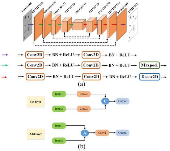 In the U-net model, the feature fusion module in the up-sampling uses a cat layer, where each feature is first passed through a convolutional layer, followed by the fusion of each feature according to different weights. In the designed A-Unet model, the cat layer is replaced with the add layer. The feature maps from the down-sampling stage that bypass the two convolutional layers are directly connected to the feature maps in the up-sampling stage for fusion through residual addition. The first letter “a” in the word “addition” is used as the prefix “A” in “A-Unet”. For all the incoming features, all of the features are first superimposed, and after superimposition, they go through a convolutional layer to compute the weights. The model structure is shown in Figure 5a. As shown in Figure 5b, the add layer can reduce the parameters, and then greatly improve the speed of the network and prevent overfitting, which makes the network only applicable to the training set.