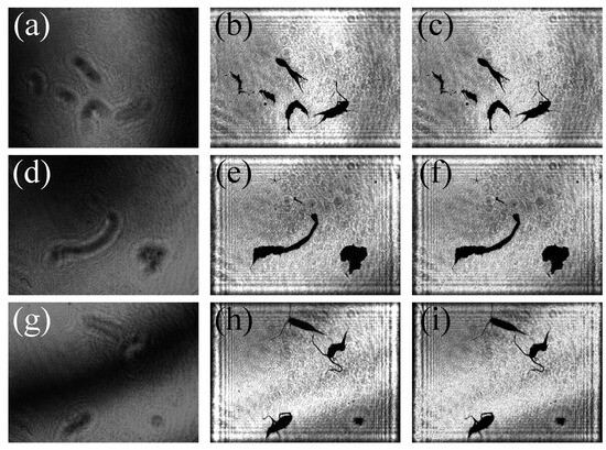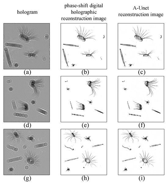 After 16.5 h of training, the trained deep learning model is applied on the test set for evaluation. Figure 14 shows the comparative analysis between the images reconstructed by GPSDH and those reconstructed by DL techniques. Figure 14a,d,g display the originally collected hologram of the samples; Figure 14b,e,h present the images reconstructed by GPSDH; and Figure 14c,f,i are the image results reconstructed by using the IDRMP. From the comparison and analysis, it can be found that a small number of tiny black dots appear in the background of the images reconstructed by the DL model. This phenomenon is caused by the noise in the holograms, which does not affect the subsequent identification and detection. According to the details in plankton images, the DL model demonstrates extremely high precision, and its performance shows no difference compared with that of traditional algorithms, which usually take a relatively long time. The two-step GPSDH algorithm takes an average of 0.9376 s to create high-quality object images with the input of 5 required images, while the A-Unet takes an average of only 0.0720 s on average to reconstruct object images. This result fully demonstrates the great potential of the IDRMP method in the field of plankton detection.