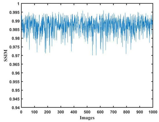 In Equation (12), x and y represent the two normalized images to be obtained, respectively, μx and μy are their mean values, σx and σy are the standard deviations for them, σxy is the covariance of x and y, and c1 = (k1L)2, c2 = (k2L)2 are two constants with k1 = 0.01, k2 = 0.03. For an 8-bit binary image, L = 255. The values of SSIM are distributed in the range of (0, 1). The closer the value is to 1, the higher the similarity. The SSIM value of two identical images is 1.