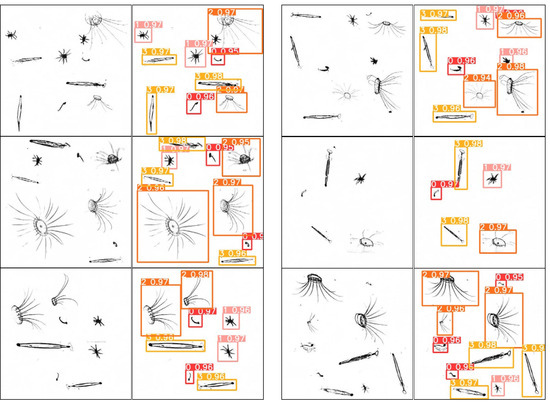 The model was then validated using the plankton map, and some of the results are shown in Figure 10. In the second and fourth columns, the numbers 0, 1, 2, and 3 above each box represent plankton of Appendicularian, Echinoderm, Hydromedusae, and Chaetognath, respectively, and the other decimal number behind each of them is the confidence level, which indicates the possibility of the detection box containing the target.