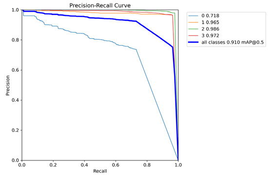 The precision–recall (PR) curve is the detection accuracy–detection rate. When the PR curve is closer to the upper right, it indicates that the performance of the model is better. The PR curve of the plankton by our biometric model is shown in Figure 11: