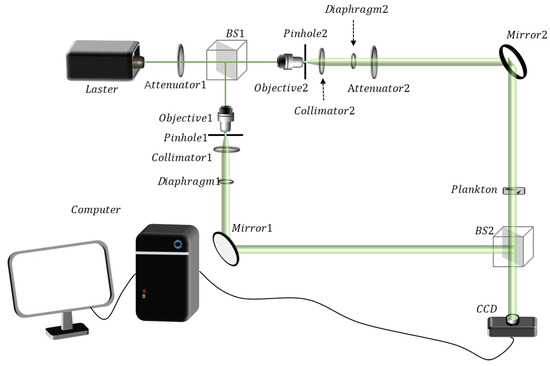 The experimental setup is shown in Figure 12. A green laser (MSL-FN-532, produced by CNI from Changchun, China) is adopted as the light source. The laser beam is split into two by a beam splitter. Then, the two beams pass through the objective lens, pinhole filtering, and a collimating lens, respectively, to obtain high-quality uniform plane waves. One of the beams serves as the reference wave, while the other is used as the object wave to irradiate the plankton samples and trigger the diffraction effect. The diffractive wave carries the detailed structural information of the samples. Subsequently, it overlaps spatially with the reference wave through a beam combiner, thus generating a hologram, which is then recorded with high fidelity by a CCD (DH-SV1410FM, produced by IMAVISION from Beijing, China). During the process of the experiment, the phase shifts are effectively generated by disturbances such as air disturbance and vibrations from optical devices.