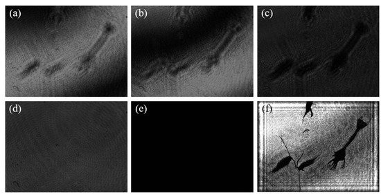 A set of plankton sample data obtained by the two-step GPSDH technique is presented in Figure 13. Specifically, (a) and (b) display two interference patterns required by the reconstruction algorithm, and these interference patterns can be obtained simply by introducing phase shift [18]. The phase difference between the two holograms is 1.7902 radians by GPSDH calculation. Figure 13c,d,e are the object wave, the reference wave, and the background, respectively. They are needed in the reconstructed process of the two-step algorithm. Finally, the image shown in (f) is the reconstructed image of the plankton sample by two-step GPSDH, which clearly demonstrates the morphological and structural characteristics of the sample.