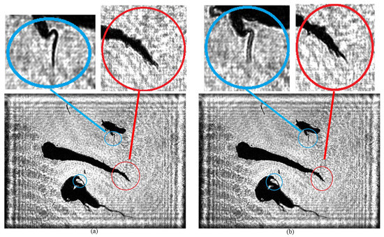 As shown in Figure 15, there are significant differences in the imaging clarity of plankton on different planes when using traditional holographic algorithms. In Figure 15a, the branch and angle structures of the two plankton marked by the blue circle are clearly visible, while the tail branches and angles of the Tunicate plankton within the red circle are difficult to identify. In contrast, in Figure 15b, the tail of the Tunicate plankton within the red circle shows clear bifurcation and protrusion characteristics, but the branch and angle structures of the two plankton within the blue circle are somewhat blurred.