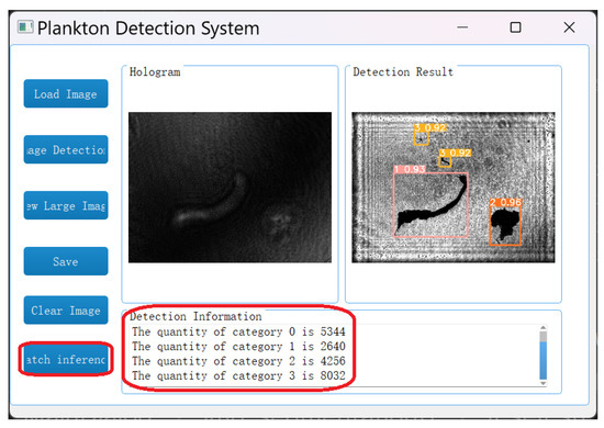 To better meet the requirements of practical applications, a batch detection function for this system is developed. As shown in Figure 18, by clicking the “batch inference” button, users can select a folder containing any number of plankton holograms. The system will quickly identify all the holograms in the folder and display the types and quantities of each type of plankton. Taking this experiment as an example, a folder containing 4000 plankton holograms is selected. The batch detection function can identify 5344 Copepods (labeled as “0”), 2640 Tunicates (labeled as “1”), 4256 Polychaetes (labeled as “2”), and 8032 other types of plankton with non-target particulate matter (labeled as “3”).
