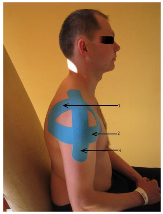 For the study, KT manufactured by Nitto Denko Corporation (Osaka, Japan) was used. The KT application (Figure 1) combined three techniques: the ligament technique (the tape was applied with maximum stretch over the acromioclavicular joint), the modified muscular technique (on the deltoid muscle), and the functional technique (from the shoulder process to the distal attachment of the deltoid muscle, the tape was applied starting in a 90° elevated position, with gradual lowering of the limb as it was adhered).