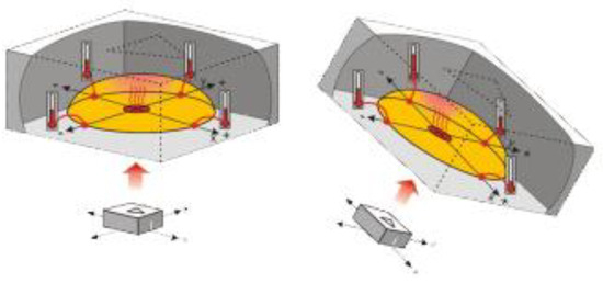 Accelerometer operation diagram. When the accelerometer is level, the hot gas rises to the top center of the chamber, causing all sensors to measure the same temperature. Tilting the accelerometer shifts the hot gas, allowing detection of static and dynamic acceleration by comparing the sensor temperatures, with the accelerometer converting these into pulse duration signals for microcontrollers.