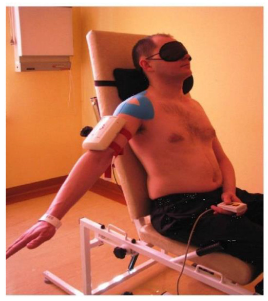 Patient’s position during joint position sense examination with the position-sensing transducer fixed to the arm.