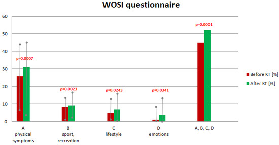 All participants from the instability group (n = 30) completed a functional self-assessment using the WOSI questionnaire. The overall score from the survey was an average of 45% before KT therapy and 52% after therapy (Figure 4). The results improved in each question group, with all differences being were statistically significant (Figure 4).