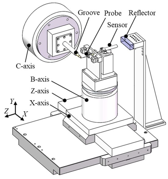To measure the full cross-sectional profile of the high-aspect-ratio micro-groove and eliminate the measurement blind areas at the bottom and sidewalls, a measurement system with a deflection probe was developed, as shown in Figure 1. The basic components of the system consisted of four motion axes: X, Z, B, and C. The groove was fixed on the C-axis, which rotated to change the measurement cross-section. The probe was mounted on a combination of the X-, Z-, and B-axes, with the X- and Z-axes used to calibrate the relative position between the probe and the workpiece. The B-axis adjusted the deflection angle of the probe, and the coordinated movement of the four axes enabled the measurement of the full cross-sectional profile of the groove.