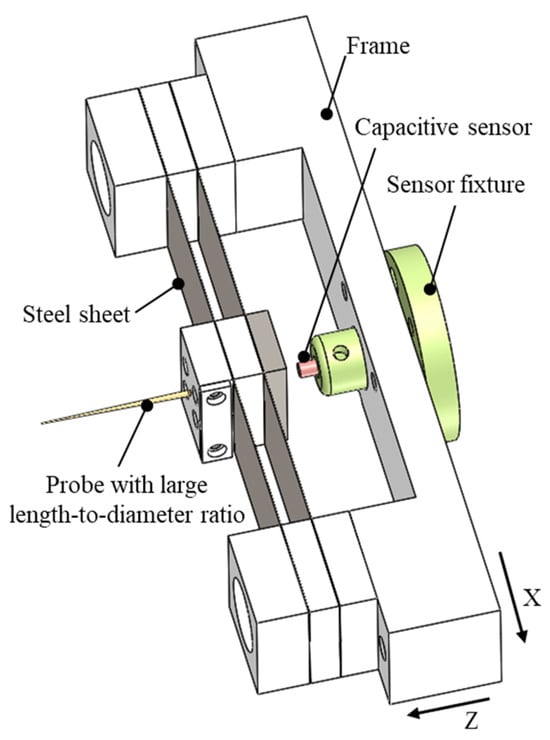 The groove exhibited a high aspect ratio, which required the probe used for the bottom profile measurement to have a large length-to-diameter ratio. The probe was mounted on a force feedback structure, as shown in Figure 2. This structure consisted of a large length-to-diameter ratio probe, dual-layer leaf springs, and a capacitive sensor. It converted changes in the workpiece profile detected by the probe tip into output signals from the capacitive sensor, which were collected and processed by the signal detection system [,,].