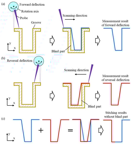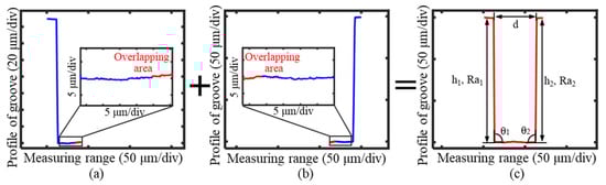 To measure the profile of the groove sidewalls, the probe was deflected at a specific angle to ensure a stable contact between the probe tip and the sidewall. However, the deflected probe created blind areas at the intersection of the sidewall and bottom surfaces. These blind areas could be eliminated by conducting measurements with the probe deflected in two directions. Overlapping regions were present in the measurements of the groove bottom profile. By stitching these overlapping regions, the two measurement results complemented each other, which effectively eliminated the blind areas from the individual measurements and enabled the detection of the complete cross-sectional profile of the groove.