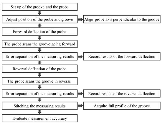 The process for measuring the complete cross-sectional profile of the high-aspect-ratio micro-groove is illustrated in Figure 4. The local profile of the groove was detected using the deflected probe scanning method. After the forward deflection measurement was completed, the probe was deflected in the reverse direction to repeat the measurement. The complete cross-sectional profile of the groove was then obtained by stitching the results from the two measurements. The relative position between the probe and the workpiece was calibrated before the measurement to enhance the measurement accuracy. Measurement system errors were monitored during the process, and measurement errors were compensated for and eliminated in the results. The reliability was further improved by calculating the standard deviation and measurement uncertainty through repeated measurements.