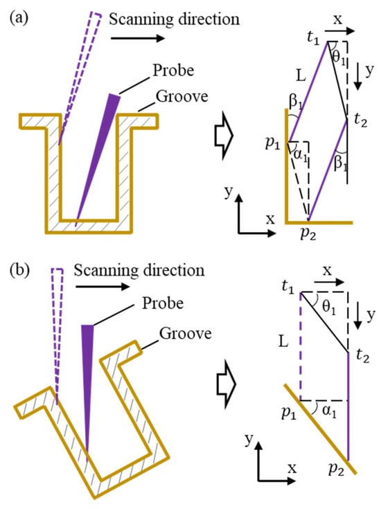 To detect the sidewalls of the high-aspect-ratio micro-grooves effectively, the probe and workpiece were deflected at specific angles during the measurement process. As shown in Figure 5, the effects of the probe deflection and workpiece deflection on the accuracy of the measurement results were analyzed. In the case of a deflected probe, as illustrated in Figure 5a, the probe scanned along the detection direction, and the variation of the profile position was t1t2 based on the probe coordinates. The variation formed an angle θ1 with the X-axis. The actual profile variation was p1p2, which formed an angle α1 with the X-axis. By setting point p1 as the coordinate origin, the coordinates of each point were defined as p1 (0, 0), p2 (x, −y), t1 (L*sinβ1, L*cosβ1), and t2 (L*sinβ1 + x, L*cosβ1 − y), where L represents the probe length and β1 represents the angle between the probe and the Y-axis. The measured profile information and the actual profile information of the workpiece were described by Equations (1) and (2):